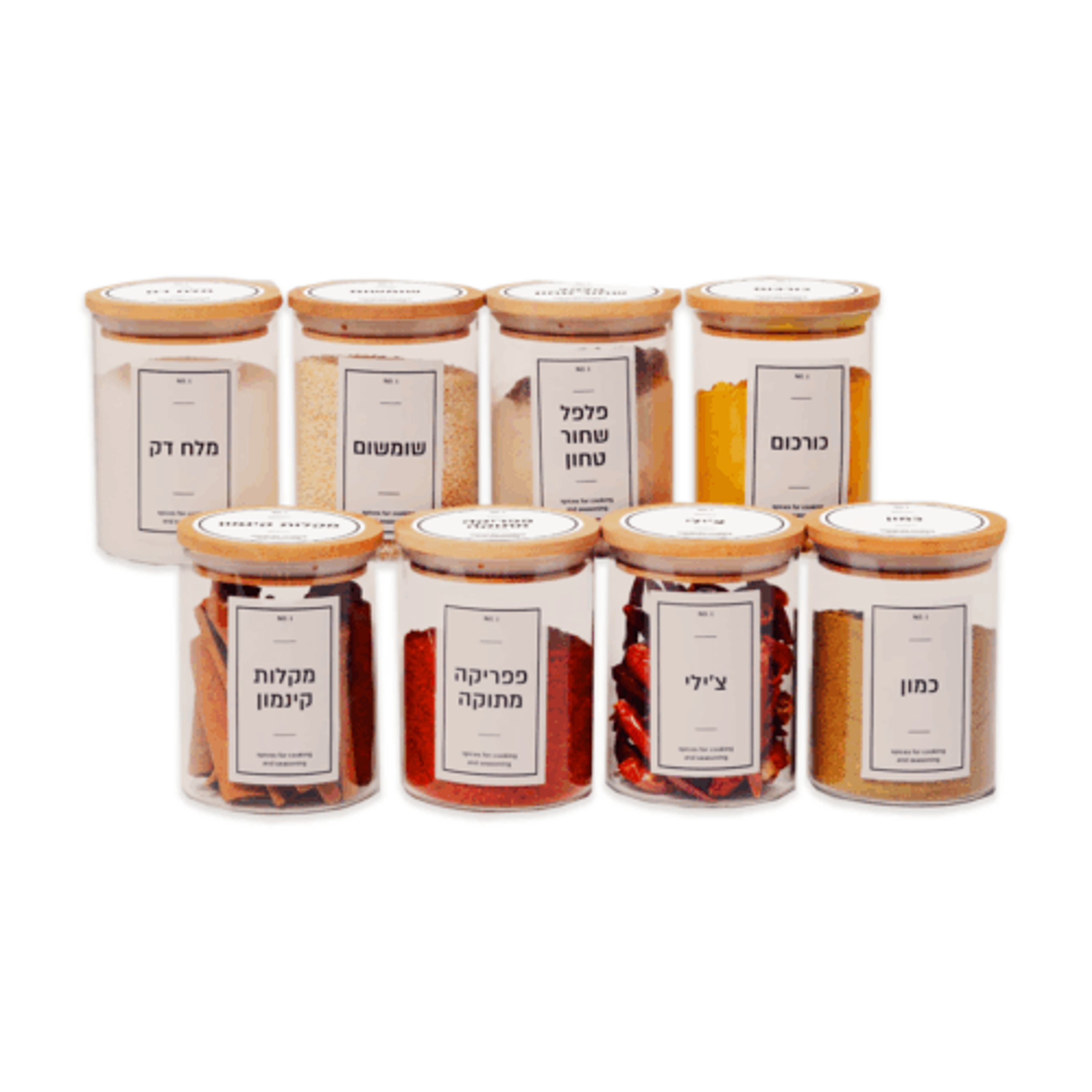 מארז 8 צנצנות תבלינים מזכוכית מכסה עץ,