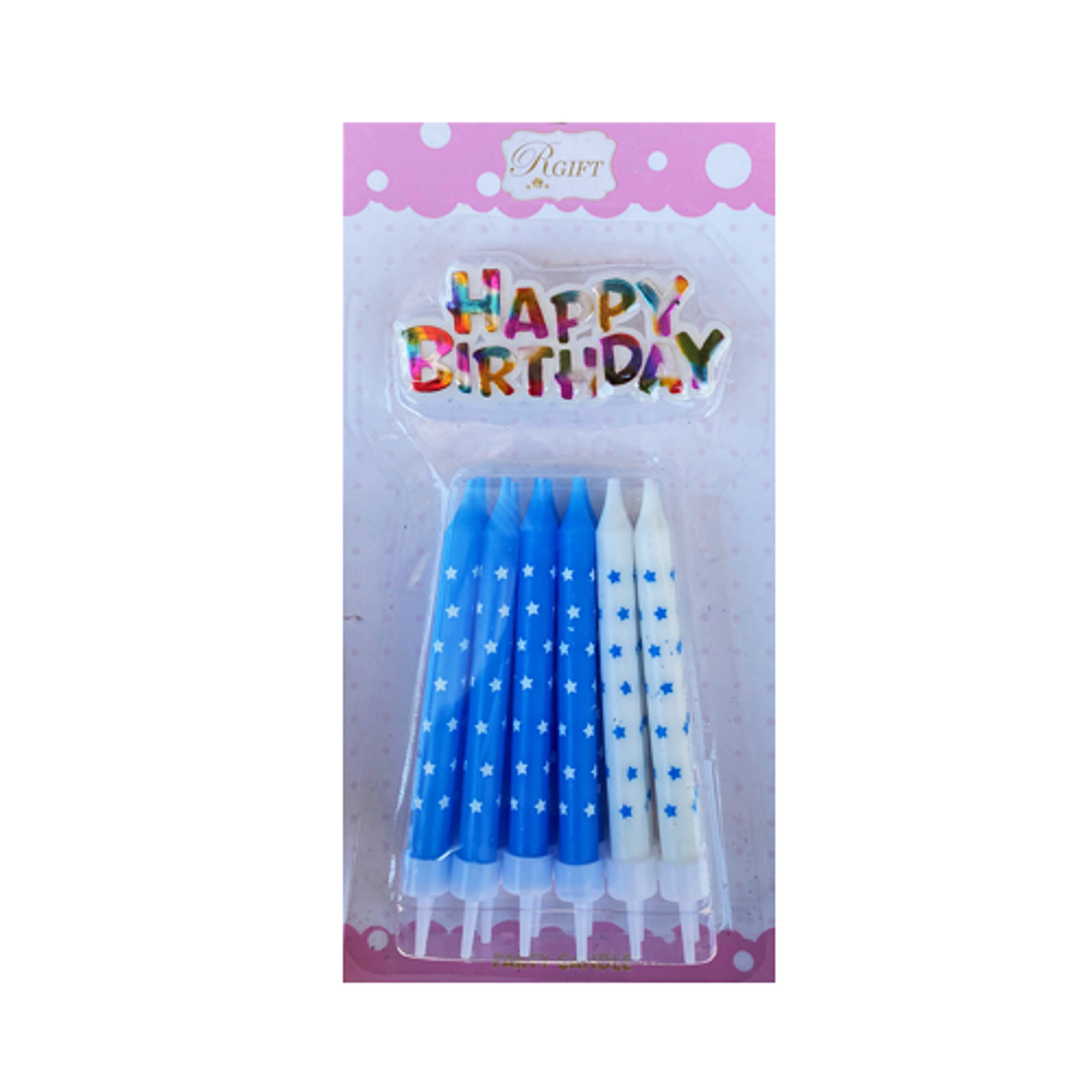נרות יום הולדת HAPPY BIRTHDAY - כחול לבן , 12 נרות  + 12 מעמדים נר עם כוכבים +ברכה HB
