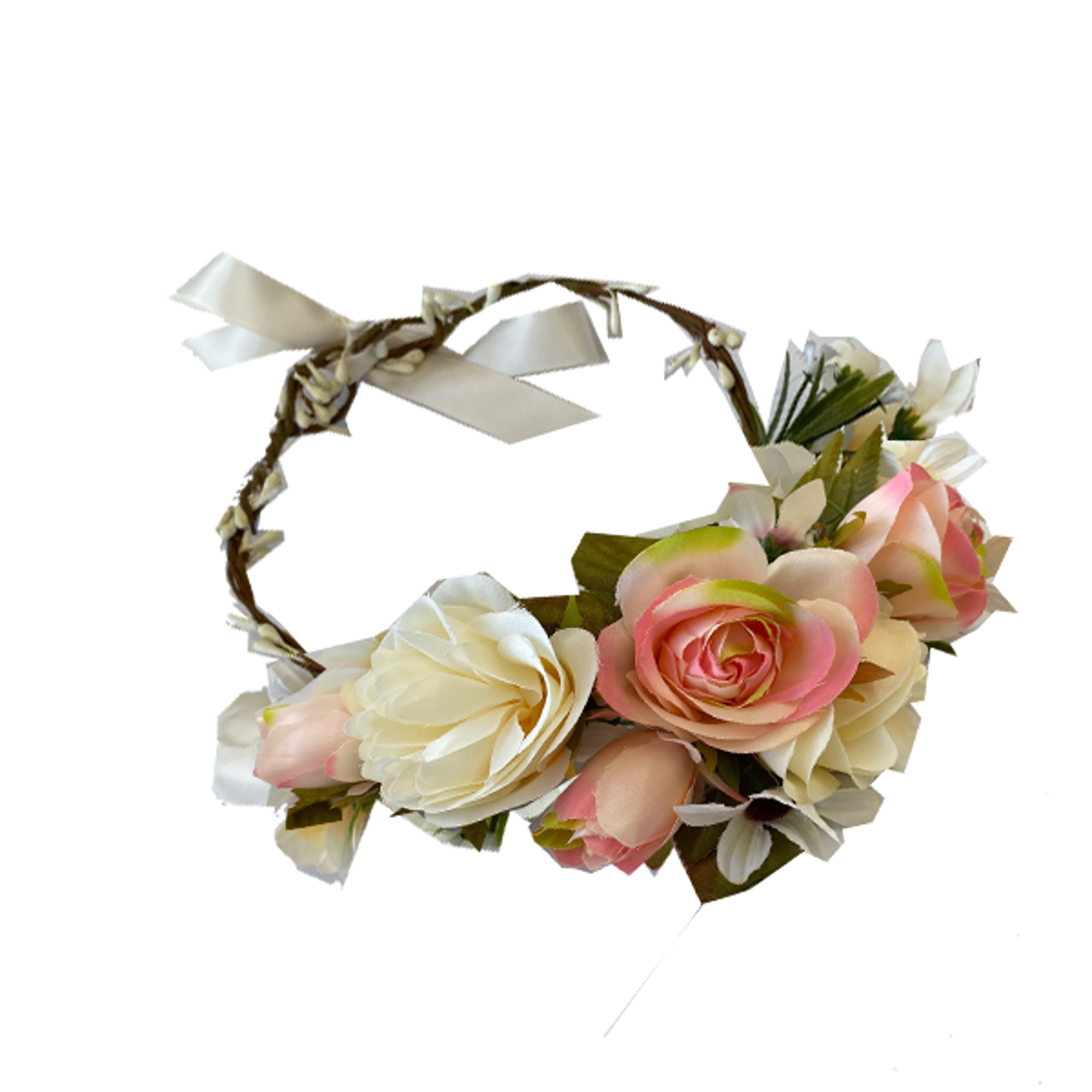 זר פרחים לראש פלסטיק - קרם ורוד,זר לראש,זר פלסטיק לראש,זר יום הולדת,זר לשבועות