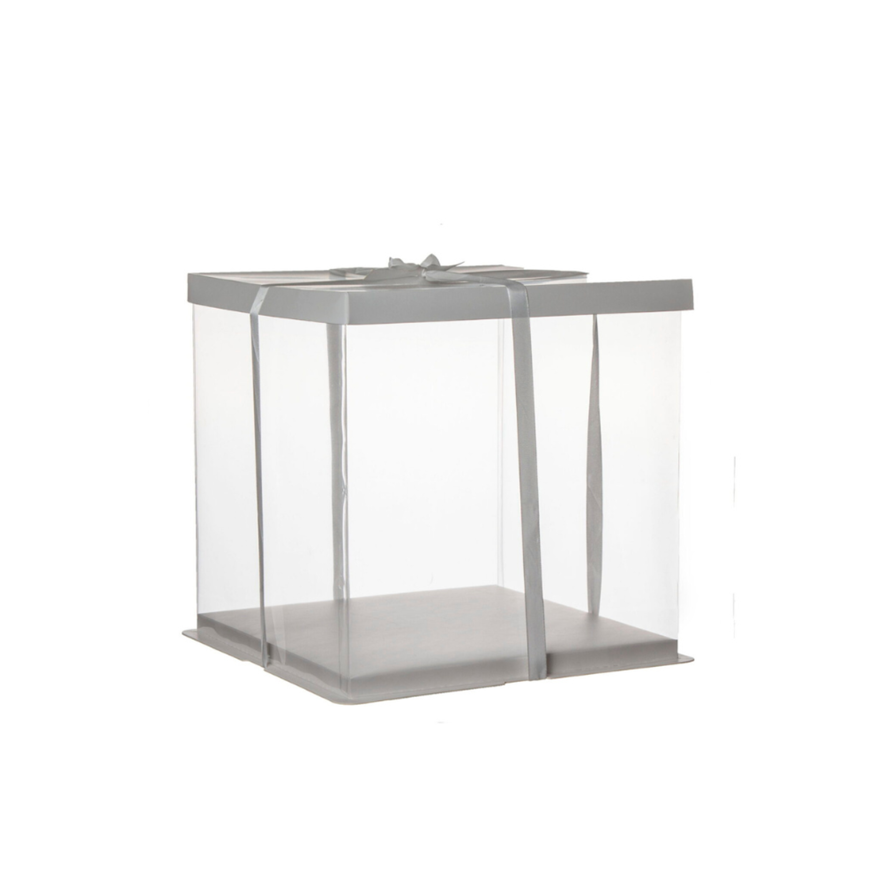 קופסה שקופה עם במה לעוגה מגיעה עם סרט לקשירה.