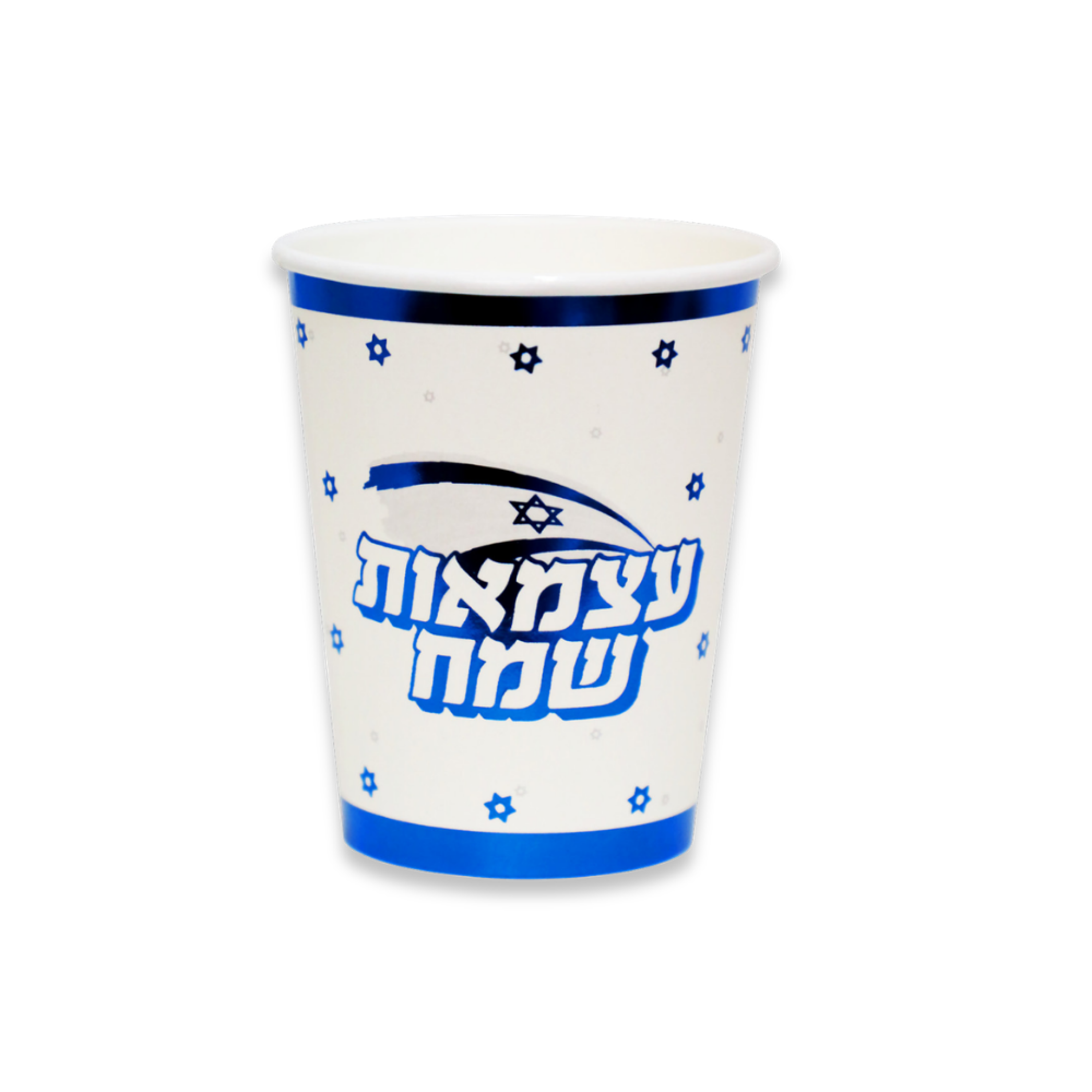 כוסות נייר מעוצבות בצבע כחול עם הכיתוב "עצמאות שמח", מושלמות לחגיגות יום העצמאות.