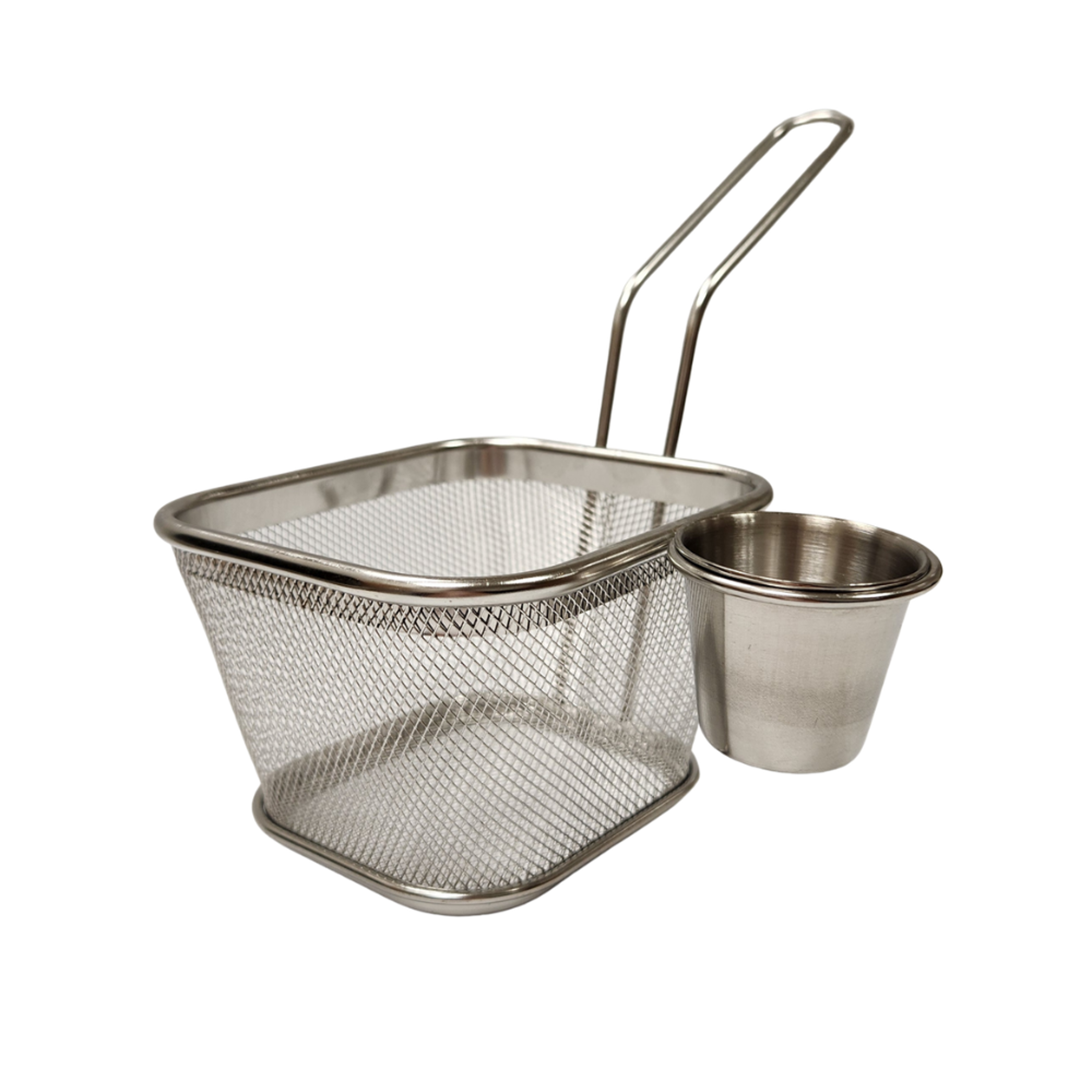 רשת מתכת מעוצבת להגשת צ'יפס, נאגטס ונשנושים נוספים, הכוללת כוסית ייעודית לרוטב.